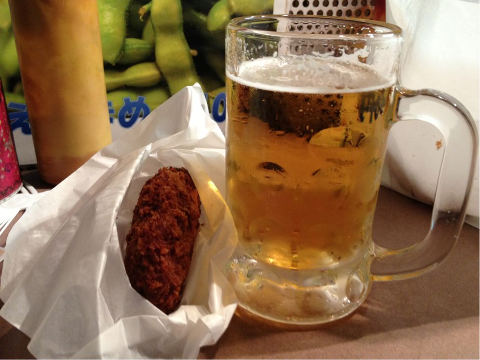 生中半額190円+メンチ100円+写真にはないけど白身魚のフライ170円!