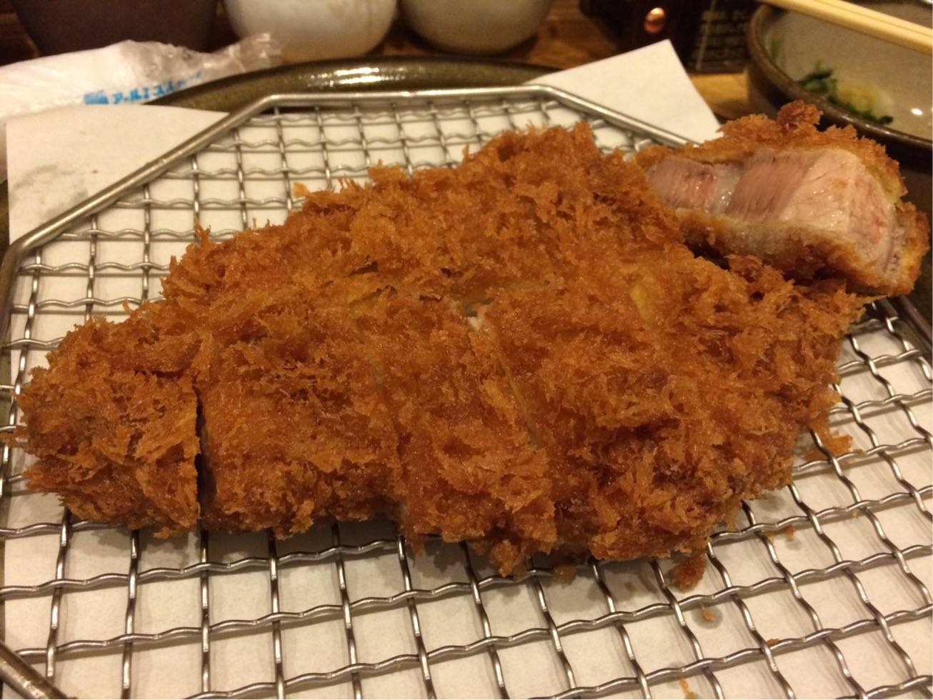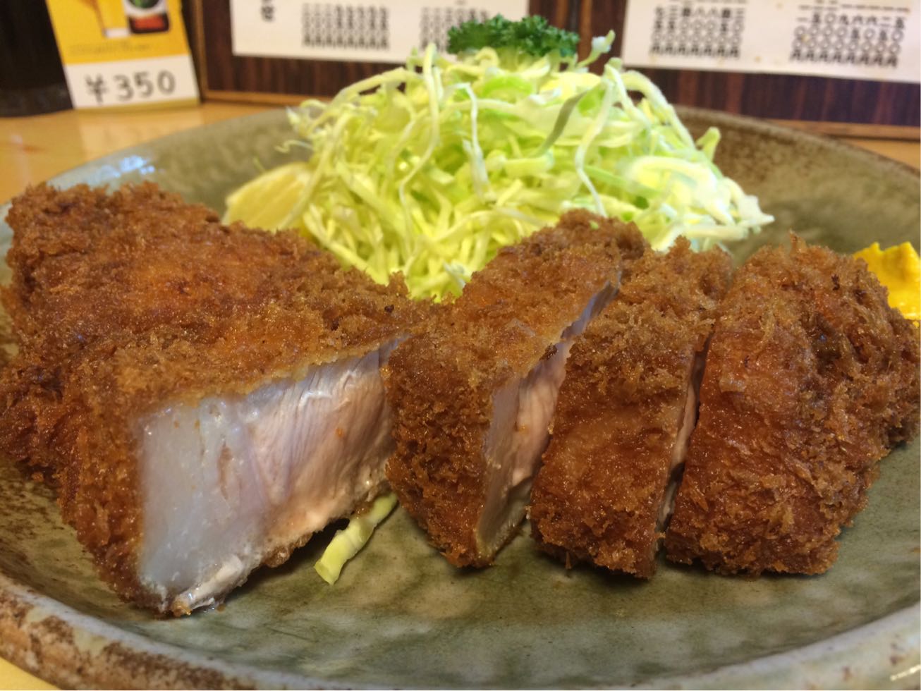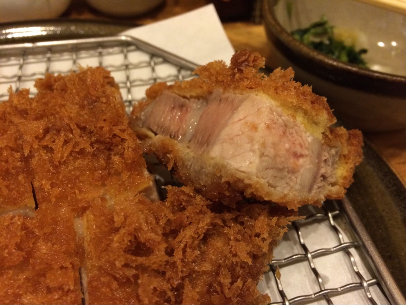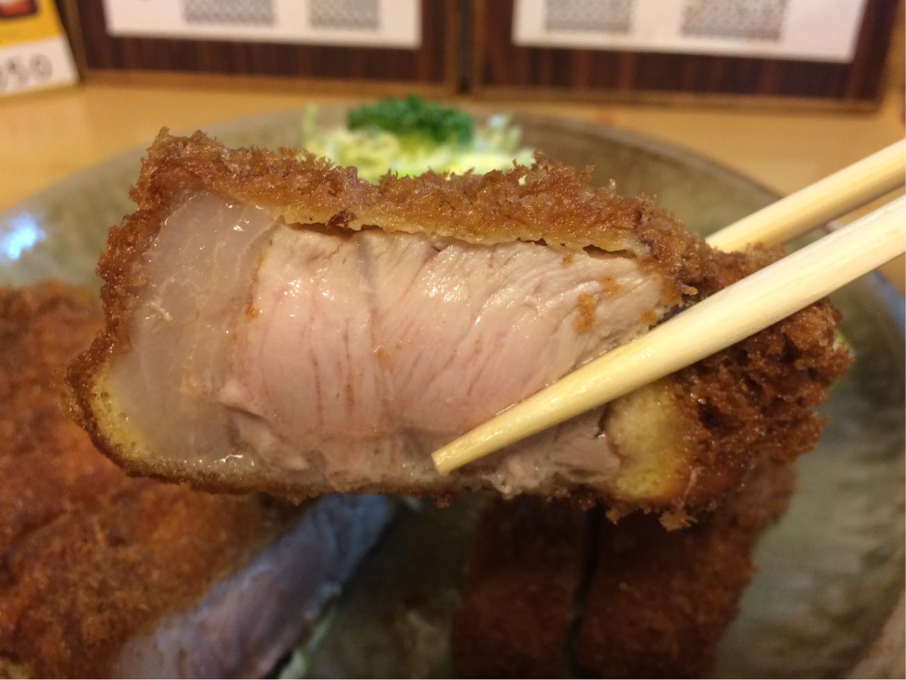 ここは下諏訪…。 以前一度だけ訪れたことのあるとんかつ屋さん。  ランチタイムはきっかり12時45分には暖簾を下げてしまいます。 遅めに入るとロースカツは揚げるのに時間が掛かるからダメと言われる。  ので… 本日はトンカツ定食!  じゃじゃ〜ん! 厚さは5cmはあるでしょう^ ^ 揚げ方も職人芸です! 美味しゅうございました! 星★★★ リピート度★★★  豚汁の肉も脂身有りでした(笑)