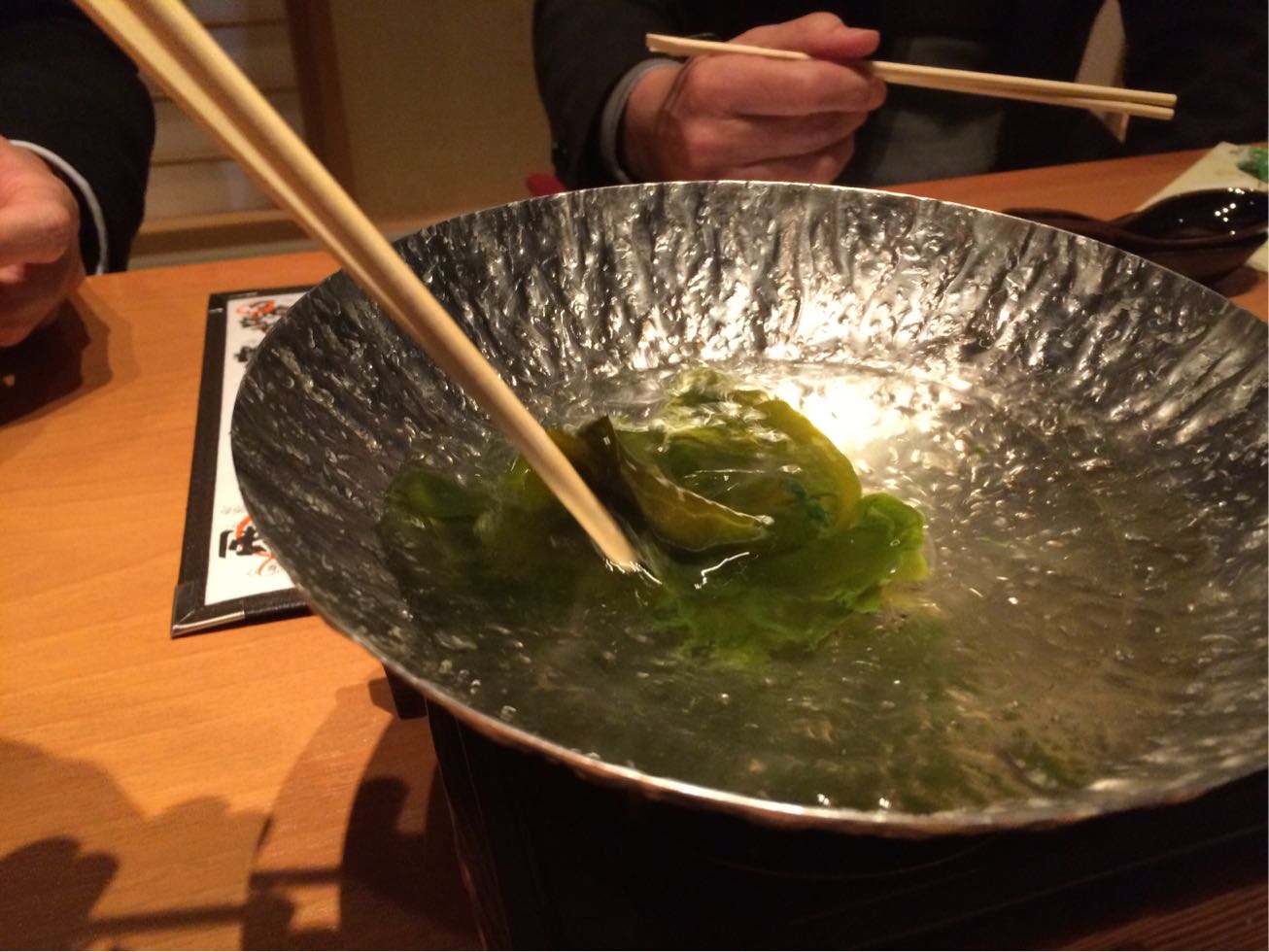 とんかつの後は新潟に移動。 夜は古町にてご宴会^ ^  お通しはワカメしゃぶしゃぶ!! この旨さに感動^ ^^ ^  この後…magnumは日本酒飲み比べやオススメ米焼酎ロックなどなどで撃沈!