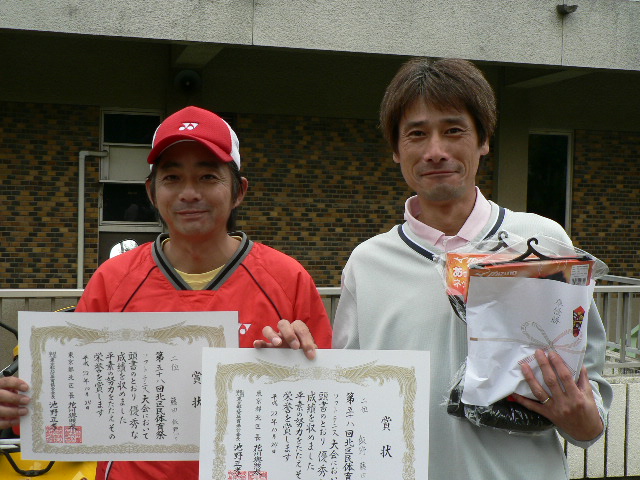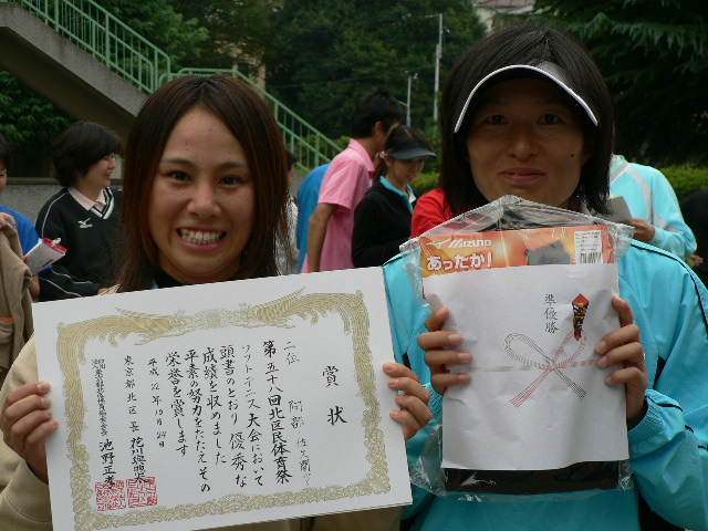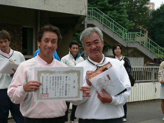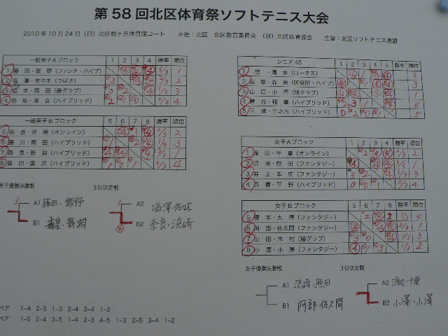 とりあえず気を取り直して今シーズン残りのローカル戦を頑張ろうと思っている今日この頃です。 まずは今シーズンカウントダウン第1戦! 「北区大会」に参戦してきました!! 横浜からは熊ママが初参戦! 子供相手用のアイテムまで持参して頂いて(笑) magnum・バズーカペアの結果は一般で準優勝でした。 優勝の賞品がウエアだったので何とかGETしたかったんだけど。。 決勝で若手の小僧達に・・ それもなんちゃってダブル前衛に・・ 逆転負けでした!! 優勝はこの小僧達(笑)だ~~!! 子供の頃から面倒見ていたケンと今期富士桜に入った新淵君!! 悔しいけどおめでとうございます!! シニア45の優勝は山口・小澤ペア! 大会終了の後、シニアチャンピオンと3試合練習ゲームやらしてもらいました。 結果は3勝0敗だったから本日は良しとしましょう(笑) 結果はこれ↑ そして各入賞者は! 北区はあと「なるそ~大会」を残すだけとなりました! 連盟の皆さん今年もお疲れ様でした!! | カウンター