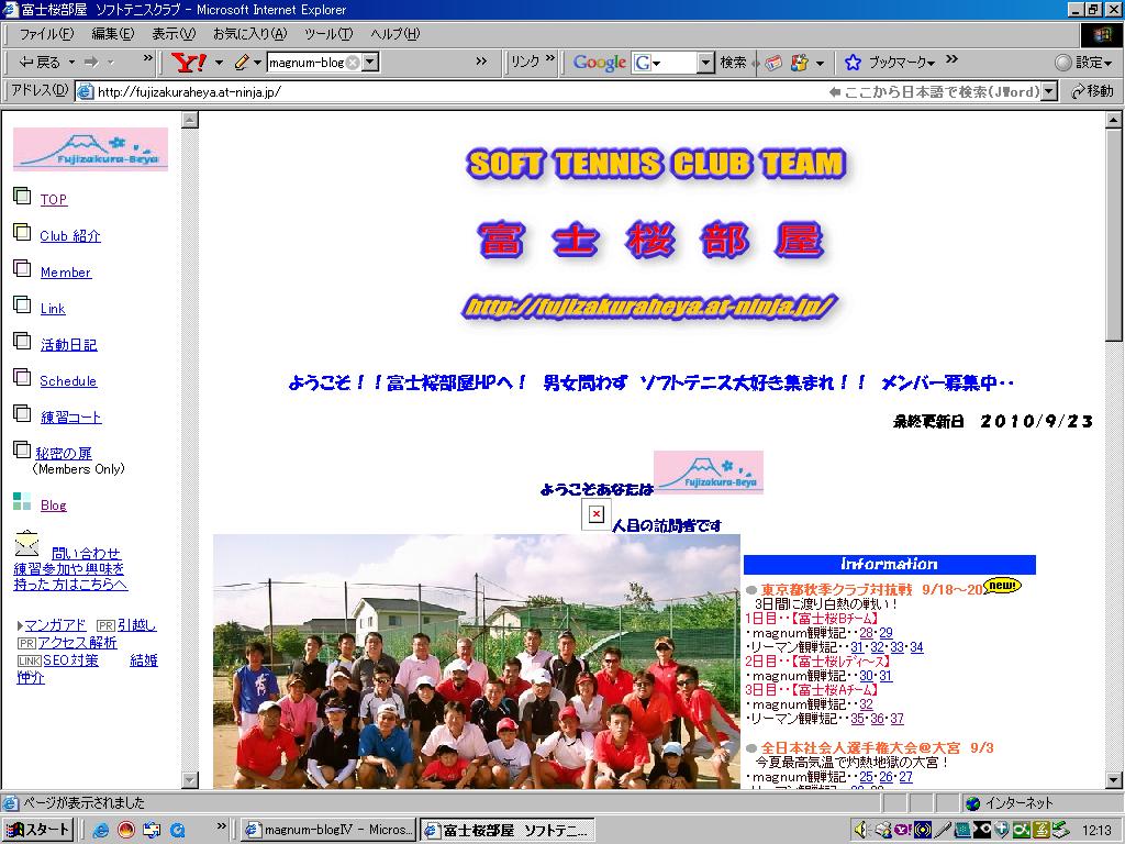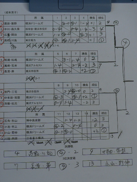 毎年恒例の中華街ツアー+横浜オープン選手権が開催されました。 昨年と今年の春優勝して3期連続を狙ったmagnum・バズーカペアでしたが・・ 予選ブロックでよもやの2勝1敗で三つ巴に! 同じブロックだったリーマン・よっちゃんペアには勝ったんだけど・・ ブロック予選最終戦でG2-4で負け。 得失ゲーム差では同率だったんだけど対戦で予選落ちでした(泣) 反対ブロックではトーマス・高島平の壁ペアが! 箱抜けを狙ってましたが・・ 予選最終戦で本家ドリームズの小山・野仲ペアに負けてこちらも予選敗退。 どんな高速ボールでも正面限定では止められる高島平の壁もこの試合だけは相手後衛のライジングを止めることが出来なかった! そんな中、虎視眈々と上位進出を狙うとっきぃ! そして見事に決勝進出!! ここまで来たら是が非でも優勝してもらいたかったんだけど、足が攣るアクシデントで無念の準優勝。 優勝:高橋・川島ペア 準優勝:中牟田・常盤ペア 3位:長濱・岸ペア 結果は・・ 春にリベンジだな! PR ご心配掛けました!富士桜部屋HPを再開します!! プロバイダーの無料サービスが終わることに気付きませんでした。 新しいアドレスで再開しますのでこれからも末永くお願いいたします。 http://fujizakuraheya.at-ninja.jp/ 今年?去年だっけ? まだまだ東京選手権でしょぼかったmagnumは反省中の身ですが・・