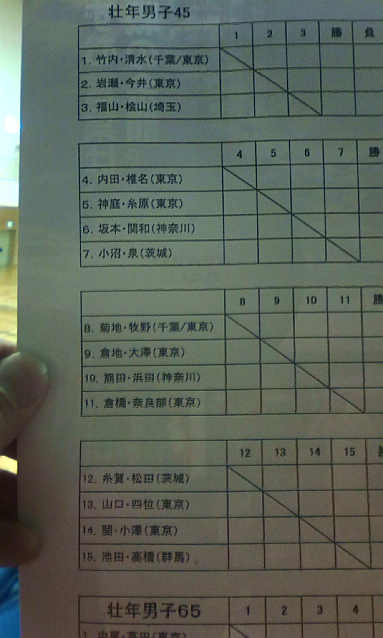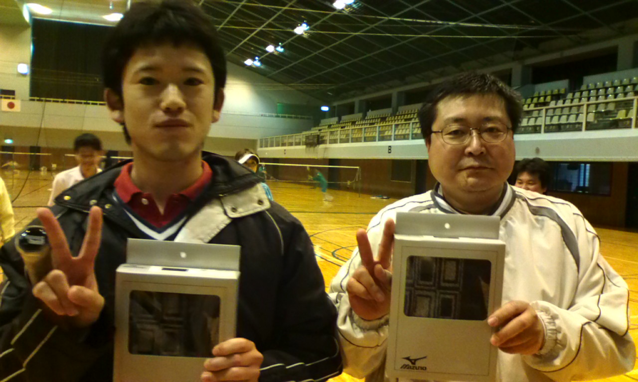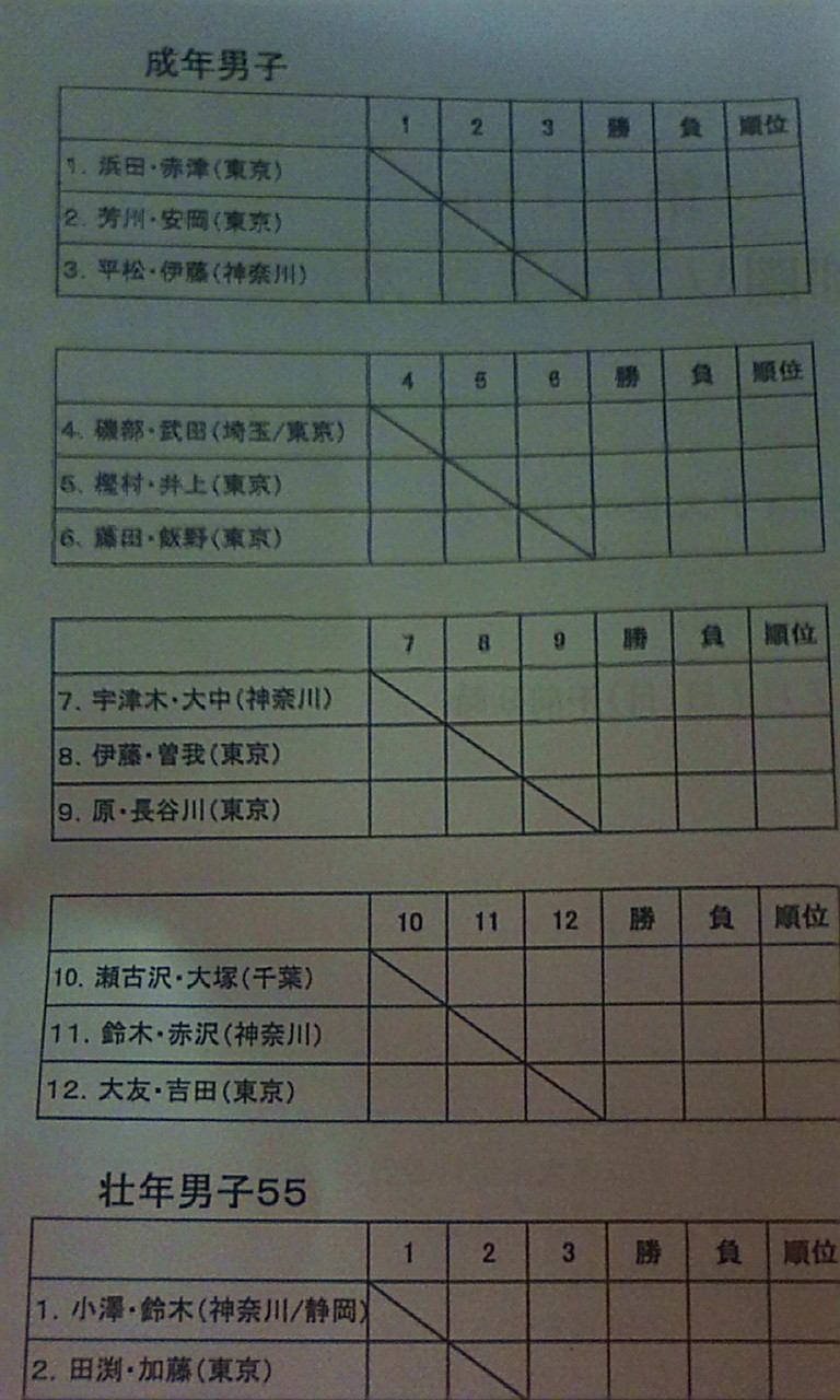 久しぶりに会うメンバー達! やっぱり良いですね♪ それにしても二年ぶりのインドア!+履き古したツルツルのオムニ用シューズに悪戦苦闘のmagnumでした。 個人的には内容はメタメタだったけど、来週に控える台東区インドア(首都圏インドア?)の為にもインドアで出来て良かった! トーマスに来週をイメージしてもっとしっかりやれ!と怒られましたけどm(_ _)m 優勝は、朝から優勝宣言していたチャバネ・ハム太郎がおやびんとのペアリングで有限実行で初優勝! なんと準優勝はおやびんジュニア1号! 手下のサルを引き連れ堂々の2位です。 たぶん本日一番安定していた後衛です。 改めて将来に期待しちゃいます♪ 3位はmagnumを3位決定戦ファイナルで破った菅谷・ケンペア! ギリギリ入賞の4位はmagnum・もんちゃんペアでした!! magnum的 第3回富士桜杯MVPは・・ やっぱり『おやびんジュニア1号』かな!! みなさんお疲れ様でした!! 現在magnumは足腰ガタガタです(泣) | カウンター