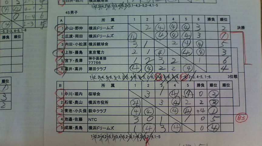 magnumは地元横浜ってこともあるけど、東京から来た刺客として富士桜の仲間も参戦!! 成年にはトーマス・高島平の壁ペアともちろんmagnum・バズーカペア!! まさか予選リーグで同じブロックになるとは思っても見ませんでしたが・・ シニア45にはレインボー広渡・モンキーよっちゃんが参戦。 シニアは予選リーグだけで5試合と超体力勝負でした。 成年男子の結果は・・ magnum・バズーカペア 優勝!! そして2週連続優勝の快挙です。秋のローカル戦には何気に強いかも? バズーカは来週葛飾の大会があるらしいので、前人未到の3週連続を目指してね~♪ シニア45の結果は・・ 初戦、ドリームズのだんでぃ・カタユペアに勝ったのがデカイ! 混戦リーグを1位通過・・そして優勝!! アベック優勝~~~♪ 横浜制覇!! 地元横浜の地を制覇され悲しげな黒帯。。 今回は出場してなかったけど・・ 逃げたか?(笑) 悲しげは人はもう一人・・ 対戦表にて何思う? 例年この大会の後中華街に行くんだけど、今年はmagnumが優勝したら新横浜で祝勝会宣言を事前にしていたので初!富士桜メンバーでの飲み会が新横浜で行われました!! いいね~解散した後、徒歩5分で帰宅出来るなんて・・ なにはともあれ・・ 皆様お疲れ様でした!! 地元ドリームズの逆襲はあるのかな?? 追伸・・ 下記の者!もっと精進しなさい(笑) | カウンター
